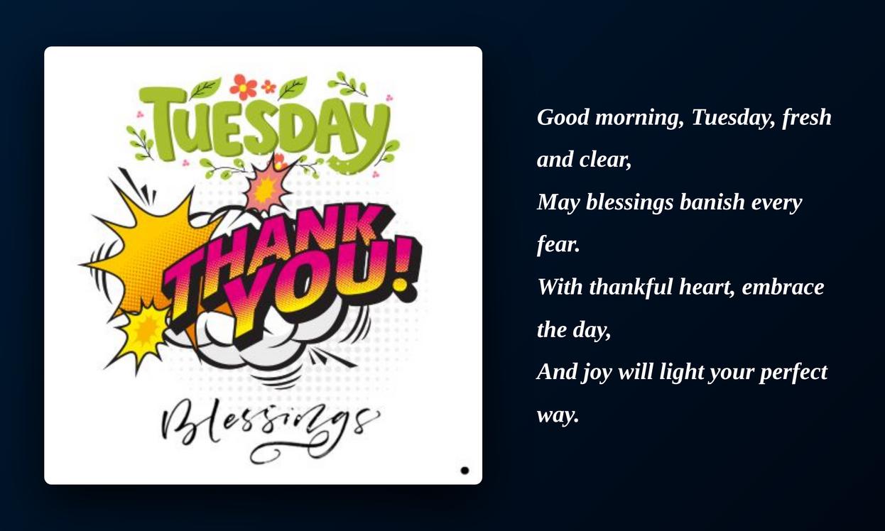 Thankful Tuesday blessings, prayers, and quotes bring peace, joy, and gratitude to the day. They help us feel calm, positive, and appreciative of life. Simple words of faith can uplift the heart and bring inner happiness. By sharing these blessings, we spread kindness and positivity to others. Keeping a thankful heart makes Tuesday more meaningful and full of peace.