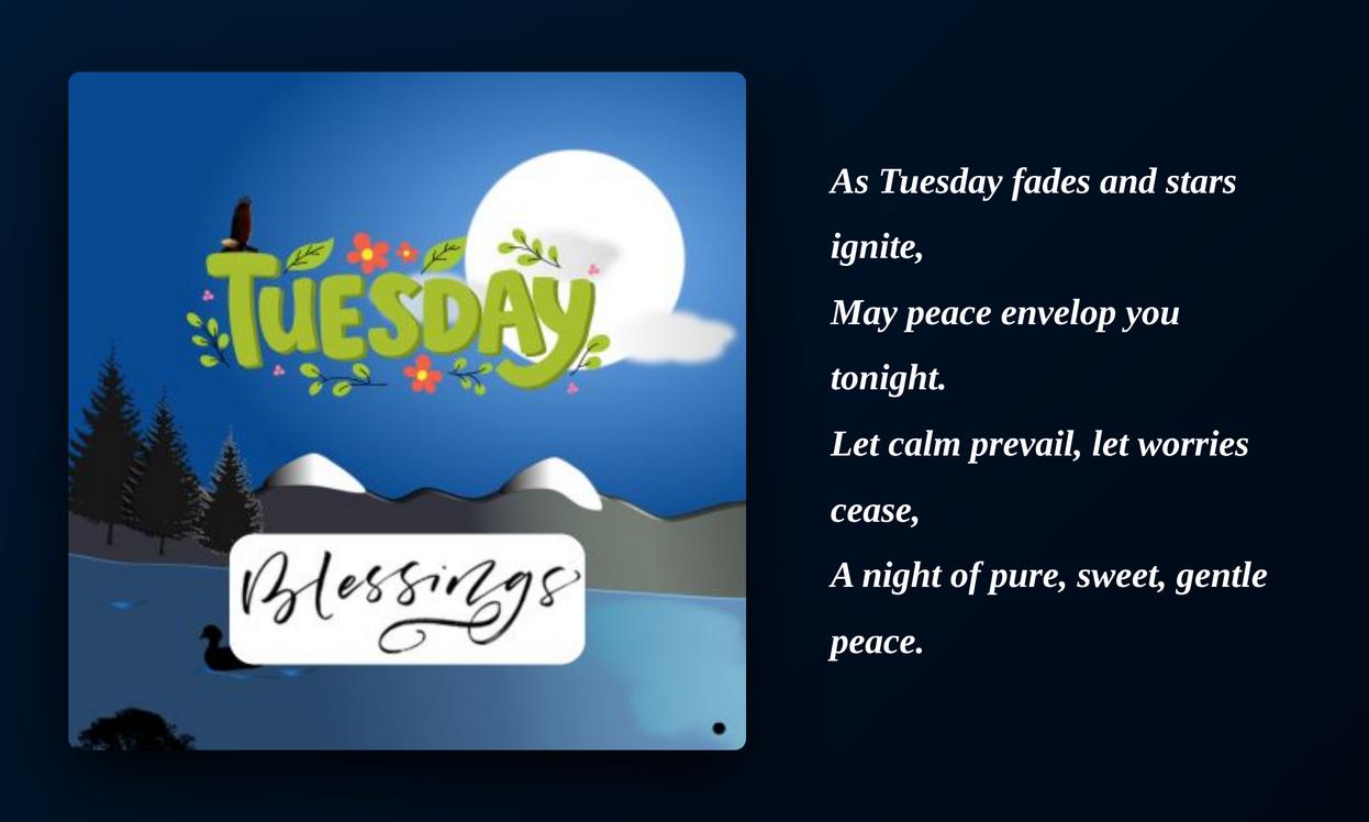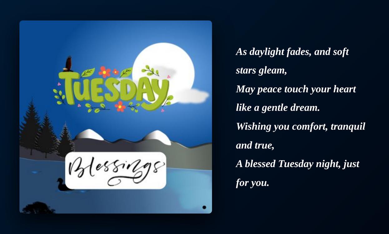 Tuesday night blessings, prayers, and quotes bring peace, comfort, and relaxation at the end of the day. They help us calm our mind, release worries, and feel thankful. Simple words of faith can bring deep rest and inner peace. By sharing these blessings, we spread love and positivity to others. Keeping faith in our hearts makes Tuesday night more peaceful and full of hope.